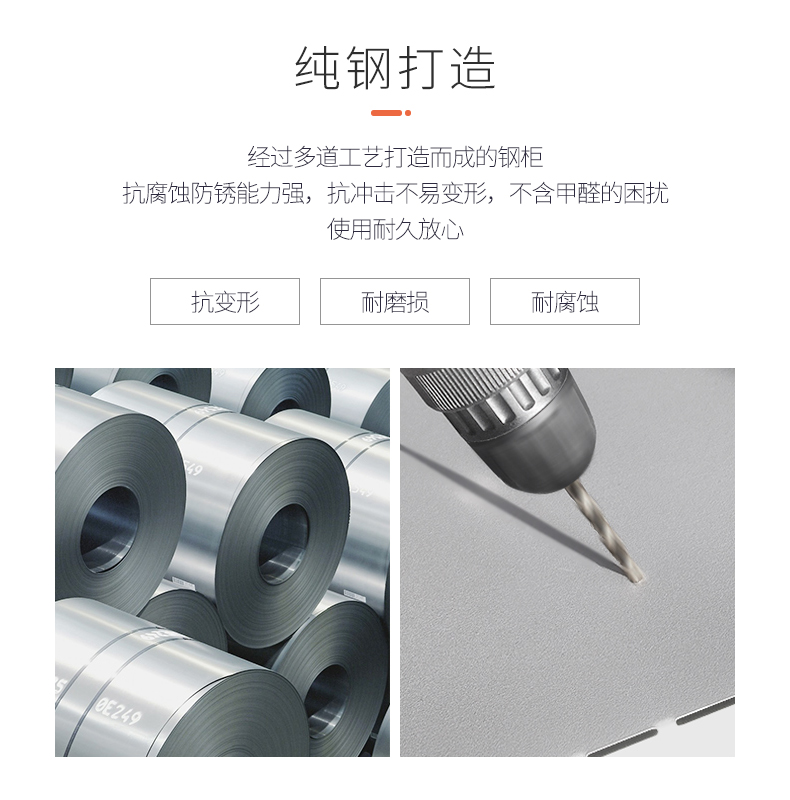 采用SPCC优质冷轧钢板,铝合金拉手,进口锁具 环保喷塑,大容量储存。